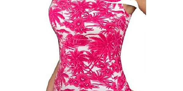 Яркий, живописный принт с тропическими листьями и хижинами. Регулируемые бретели.